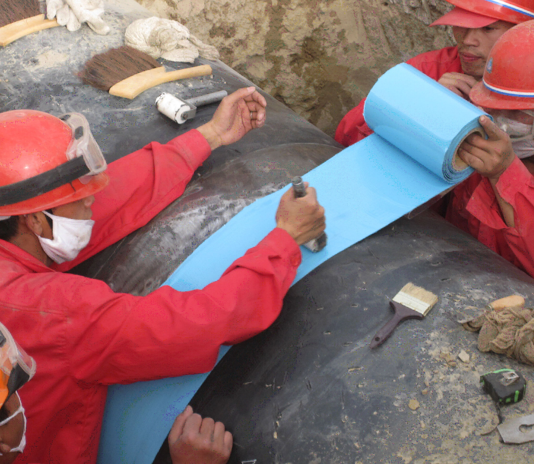 根据异形设备或钢管的尺寸将粘弹体防腐胶带裁剪成合适长度,然后将粘弹体胶带包覆于表面,完全包裹后用辊轮或其它工具进行碾压,使粘弹体与设备表面充分粘结。